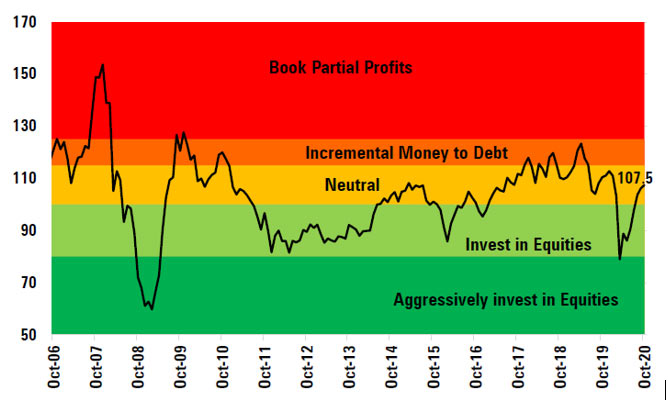 When the index is neutral, you can add equity in a staggered manner with a long term horizon while maintaining asset allocation.